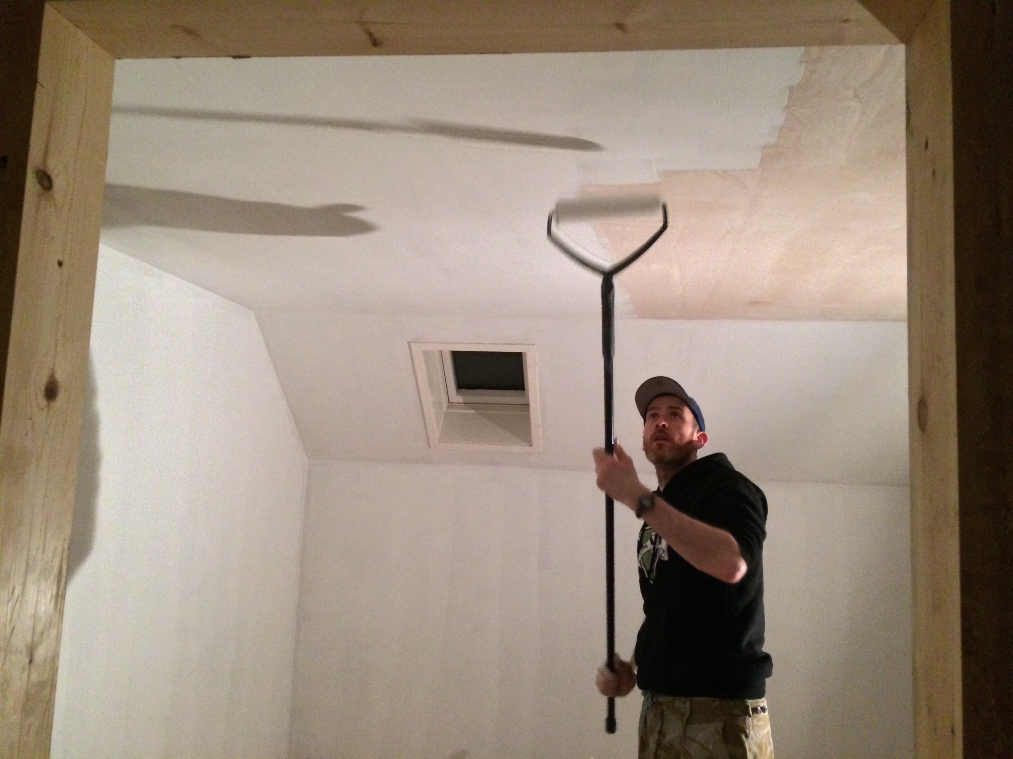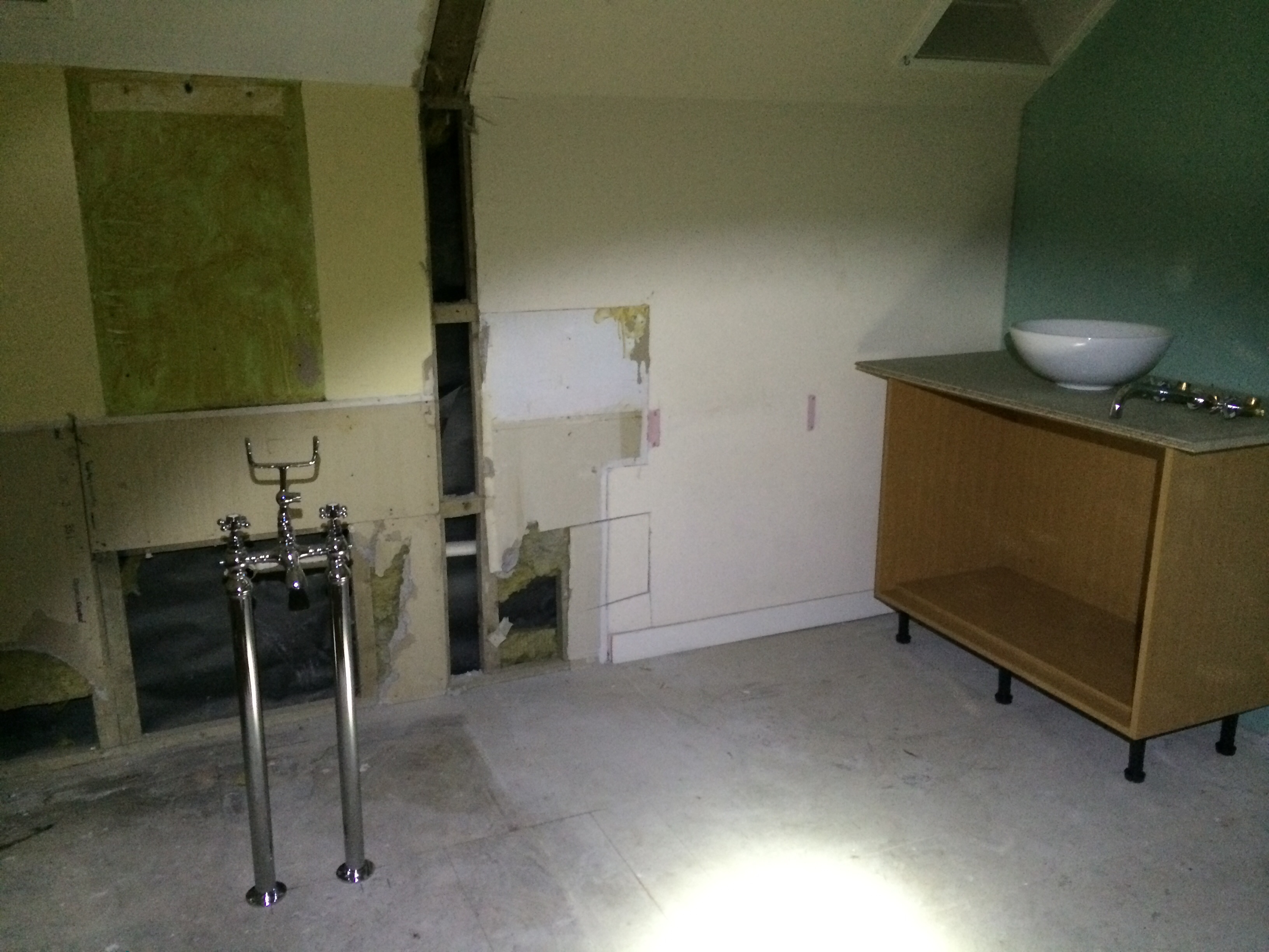You can see the join between the two old rooms in the back. The patch to the right of the join is where the ugly sink was in the spare bedroom. Behind the bath taps was the old sink and bathroom mirror that you can see at the top