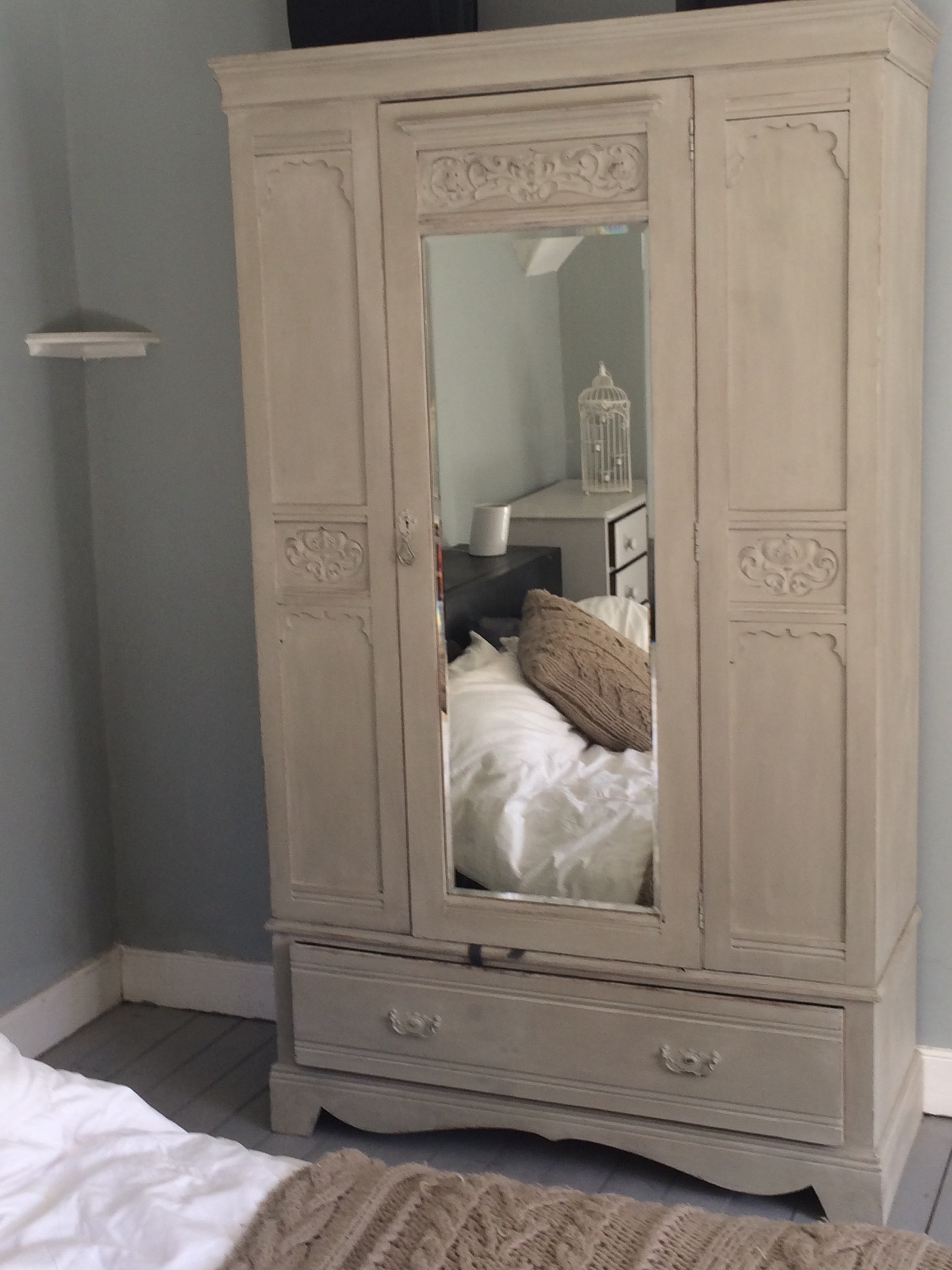 My bargainous drawers on the left from Gumtree and the wardrobe I found ready painted in a second hand shop.